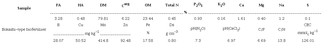 The bokashi was produced following standardized protocols, ensuring that its physical and chemical properties complied with the regulatory standards for classification as a Class “A” organic compound fertilizer, according to the Brazilian legislation (Brasil 2020) (Table 2).