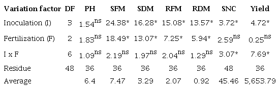 Isolates interactions with the fertilizations for yield were also observed (Table 5). In general, the highest yields were observed with interaction between fertilization and inoculation. The CIAT899 strain reached higher averages with NPK fertilization and bokashi-type biofertilizer, and it was less effective without fertilization. The RBZ14 isolate reached a higher average without fertilizer, what could indicate its efficiency, even in the absence of fertilizers. The RBZ15 isolate did not differ statistically among the treatments.