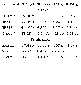 The experiment was developed in a completely randomized design, with a 3 × 2 factorial arrangement. The first factor included three inoculated treatments [two endogenous rhizobia isolates (RBZ14 and RBZ15) and a commercial strain (CIAT899)] and a non-inoculated control, whereas the second factor had two fertilization methods (mineral and bokashi-type biofertilizer) and a non-fertilized control, each one with five replicates.