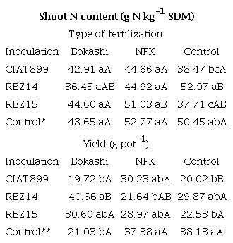 Regarding the shoot N content, the treatments showed significant differences in interaction between inoculation and fertilization (Table 5). It was possible to observe that the type of fertilizer influenced the performance of the inoculated bacteria. The CIAT899 strain and the control did not show significant differences. However, the RBZ14 isolate obtained a higher shoot N content at the NPK treatment and differed from the control. The RBZ15 isolate reached a higher N content with the bokashi-type biofertilizer than with NPK.