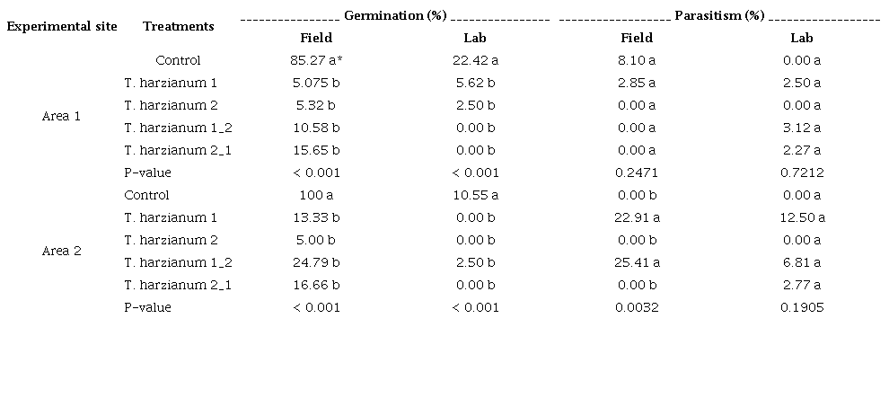 Table 1 shows the germination and parasitism of sclerotia (field and laboratory) in the Areas 1 and 2. In both areas, the biological control agents significantly reduced the germination (p < 0.001) of the sclerotia collected from the field and laboratory, when compared with the control group. In the Area 1, the biological control agents did not affect the parasitism of the field (p = 0.247) and laboratory (p = 0.7212) sclerotia. In the Area 2, T. harzianum 1 and T. harzianum 1_2 resulted in parasitism of the sclerotia collected from the field. In contrast, the laboratory sclerotia did not show significant parasitism (p = 0.1905).