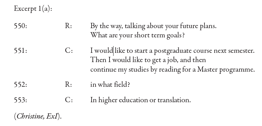 Christine commented from data in the exit interview –excerpt 1(a)– that a postgraduate was among her short–term priorities (I would like to start a postgraduate course next semester). It is perhaps interesting to note here that, for her, furthering her studies was even more important than getting a job (Then I would like to get a job). She went on to re–confirm the need for further qualifications (by reading for a Master programme). The data here clearly suggest that Christine explicitly included teaching as a part of her goals for the future. Even though she suggested an important step forward (higher education or translation), she was aware of her need for professional development.