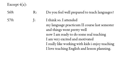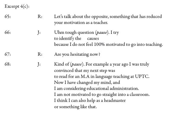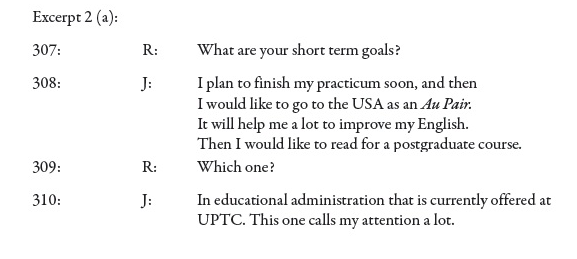 Julie also showed a sense of professional affiliation. In excerpt 2(a) –in data in the exit interview– she commented on two of her short–term professional goals: a trip to the USA and a postgraduate course. She was aware that she was to finish her teaching practicum period 'soon'. After that, she planned to go to the USA with a specific professional purpose (It will help me a lot to improve my English). Target language improvement had become her first priority; a subsequent postgraduate course also showing her direct commitment to education (I would like to read for a postgraduate course in educational administration). The data here show that Julie's professional goals included at least a two–year plan. The explanation for such a sense of alignment is explored in the excerpt below.