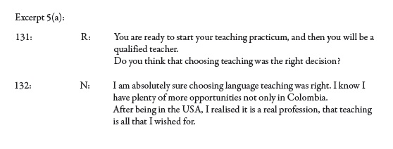 Nicholas suggested a well–grounded affiliation with teaching in excerpt 5(a) below. He first acknowledged that choosing teaching was a good decision. He also highlighted his strong alignment with his professional choice (I am absolutely sure choosing language teaching was right). Then he stated that it would also give him 'plenty of opportunities'. Although he did not specify what kind of opportunities, he suggested that they were 'not only in Colombia'. This statement clearly confirms that he saw teaching from a wider perspective. By expanding on his trip to the USA, he reasserted his professional engagement with teaching (I realised it is a real profession, that teaching is all that I wished for). This wellgrounded sense of identity is compared next with the results of specific experiences.