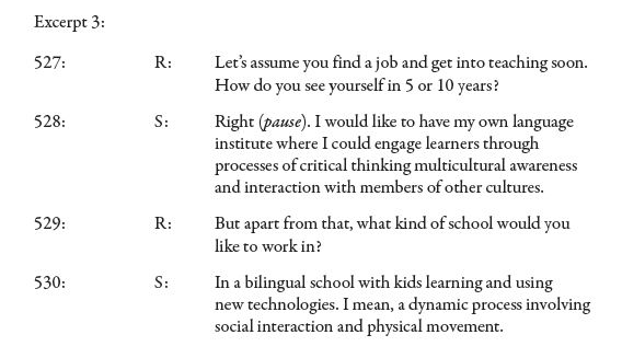 By contemplating images of ideal working environments, another student teacher projected forward her sense of career development. Sarah commented on her wish to work in her own institution (I would like to have my own language institute). The data here clearly show that teaching had become part of her future professional agenda. She did not only described herself as a teacher but specified characteristics of her imagined language institute to teach 'critical thinking and multicultural awareness'. As the researcher asked her to expand a little more on this idea, she went further mentioning a bilingual setting with pupils 'learning and using new technologies'. The data here provide clear evidence about Sarah's priority to become fully involved in teaching.