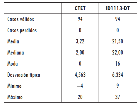 Estadísticos descriptivos de los resultados del test para medir el pensamiento crítico (CTET) y la prueba de comprensión de la lectura (ID1113-DT)