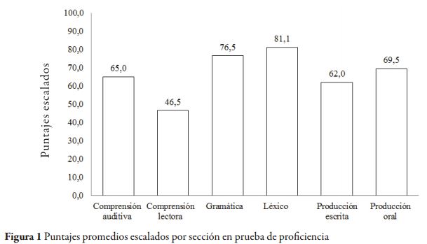 La Figura 1 muestra los promedios escalados por componente lingüístico de la prueba de proficiencia. Al comparar los puntajes promedio escalados de las secciones asociadas a los componentes lingüísticos, se observó que los mayores puntajes se lograron en las pruebas de gramática y léxico, mientras que el menor puntaje fue el de la prueba de comprensión lectora (p<0,001).