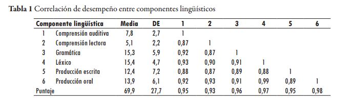 La tabla 1 muestra los índices de correlación entre los promedios de desempeño de la prueba de proficiencia. Al examinar la relación de desempeño entre los componentes de la prueba de proficiencia, se observó que las variables asociadas a la competencia lingüística mostraban una relación estadística significativa (p<0,001). Es decir, en general, un sujeto con alto rendimiento en un aspecto lingüístico también obtenía altos valores en los otros; mientras que una persona con valores bajos en un componente tenía valores bajos en las otras áreas.