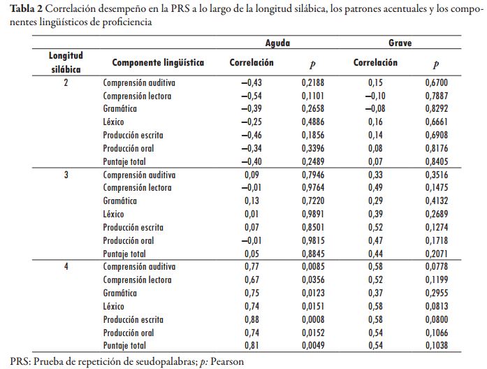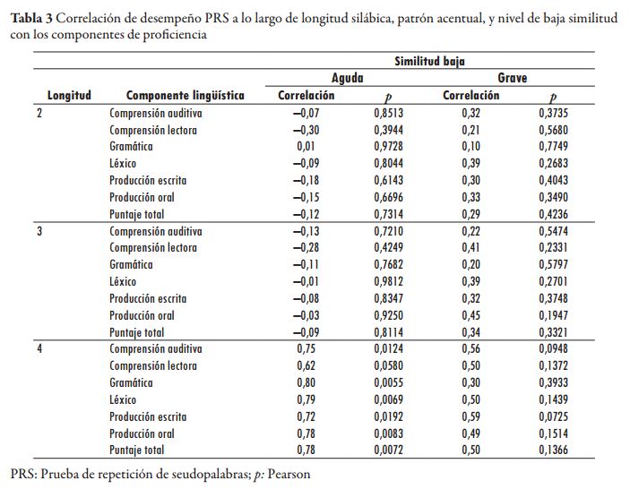Para determinar en mayor profundidad la naturaleza de la asociación lineal obtenida entre componentes lingüísticos de proficiencia y los niveles de longitud y patrón acentual, se agregó el factor de similitud a palabras de la lengua al cálculo de correlación. Se estimó el coeficiente de correlación de Pearson entre el desempeño en los componentes de proficiencia y cada uno de los niveles de longitud silábica, patrón acentual y categorías de similitud a palabras de la lengua. La Tabla 3 presenta los índices de correlación entre el desempeño en los aspectos de proficiencia y el patrón acentual, longitud silábica y grupo de baja similitud a palabras de la lengua. Los resultados mostraron que existía una correlación estadísticamente significativa entre el desempeño de todos los aspectos de proficiencia, exceptuando la comprensión lectora, con el desempeño en la PRP en las pseudopalabras de cuatro sílabas, de patrón acentual agudo y similitud baja: comprensión auditiva r=0,75 (p= 0,0124), gramática r=0,80 (p=0,0055), léxico r=0,79 (p=0,0069), producción escrita r=0,72 (p=0,0192), producción oral r=0,78 (p=0,0072). Es decir, a un mejor desempeño en dichos aspectos de proficiencia se observa también un mejor desempeño en las dimensiones de los estímulos de la PRP señalados.
