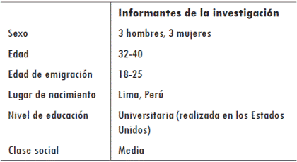 Como se aprecia en la Tabla 1, se seleccionaron los hablantes por los factores sociales que tienen en común, para poder enfocarnos en cómo la variable sexo influye en su producción lingüística. Cada uno de estos hablantes reportó ser de clase media o media baja en Lima, Perú, y que emigró a los Estados Unidos cuando tenía entre 18 y 25 años. Todos habían completado por lo menos dos años de educación universitaria en Perú, pero decidieron dejar su ciudad natal para estudiar y trabajar en los Estados Unidos. Con los trabajos profesionales que lograron conseguir en este país, cada uno de los informantes se identificó como miembro de la clase media en la actualidad. Puesto que recibieron toda su educación preuniversitaria en Lima y mantienen contacto social con otros limeños, la producción de los informantes se analiza como una muestra del habla peruana costeñaurbana que tiene pocos rasgos de fenómenos de contacto al nivel fonológico. Dado que la mayor influencia sería por el español mexicano norteño, un dialecto que escasea de aspiración, las instancias de aspiración no se atribuyen a un fenómeno de contacto. No obstante, se apreciaron influencias del español mexicano y estadounidense en el plano léxico y, por lo tanto, la posibilidad del contacto en el plano fonológico no se puede descartar.