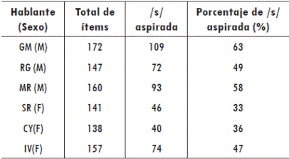La Tabla 2 presenta las tendencias generales de aspiración de cada hablante. Es evidente que mientras la /s/ aspirada es un rasgo presente en el habla de todos los entrevistados, los hablantes masculinos aspiran con más frecuencia, mientras las hablantes femeninas prefieren la variante estándar [s]. Se encontró una diferencia significativa para el porcentaje de aspiración total según la variable sexo, F (1, 4) = 9.462 (p < 0,05). Los siguientes ejemplos reflejan algunas instancias de [h] y [s] en el habla de cada informante.