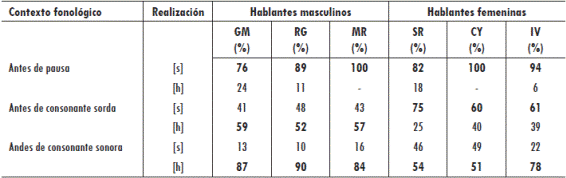 Estos ejemplos sugieren que el mismo contexto fonológico puede producir resultados variados aun en un mismo hablante. Por ejemplo, los enunciados (3) y (4) del hablante masculino RG indican que este alterna entre [s] y [h] antes de la consonante sorda