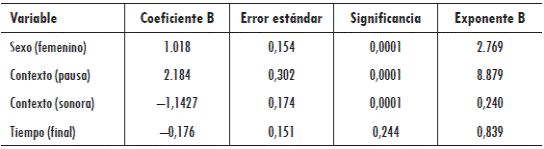 Ya que se ha determinado que el sexo del hablante y el tiempo, es decir, si la variable se produce al principio o al final de la entrevista, son significativos; también conviene determinar si es posible crear un modelo para predecir la aspiración o asibilación con base en todas las variables de la investigación. Para esta determinación se realizó una regresión logística que utiliza el sexo, el tiempo y el contexto fonológico como variables predictoras. El modelo de regresión logística resultó estadísticamente significativo, X2 (4) = 233.748, p <0,001. El modelo con todas las variables predictoras explicó el 30,1% (Nagerkerke R2) de la varianza en cuanto a la aspiración y clasificó correctamente 70,2% de los casos.
