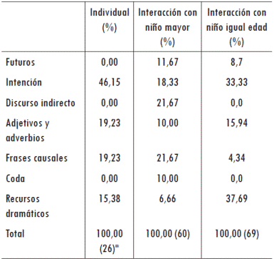Como se observa en la tabla 1, en la condición individual los niños empleaban, en mayor medida, recursos para referir la intención de los personajes (46,15%); en segundo lugar, adjetivos y adverbios (19,23%) y frases causales (19,23%); en menor medida, recursos dramáticos (15,38%), y no se observaron usos referidos a acciones futuras, ni discurso indirecto, ni el empleo de codas.