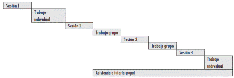El proyecto se estructuró en cuatro sesiones de dos horas en el aula, una por semana, en las que se llevaron a cabo tareas individuales y en equipo. En el período entre sesiones, el alumnado realizó una serie de actividades fuera del aula, en grupo e individuales, cuyo informe fue entregado periódicamente. La Figura 1 muestra, en el diagrama de Gantt simplificado, la temporalización de las sesiones.