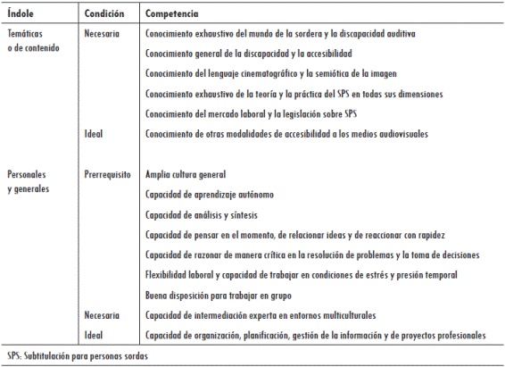 Este autor propone un listado de competencias para la SPS (Díaz-Cintas, 2006, pp. 9-14), que caracteriza el perfil del subtitulador, y aunque establece una clara diferencia entre las competencias necesarias para la SPS y la AD, también señala que existen puntos de conexión y de divergencia entre ambas tareas. Para los objetivos de este artículo, en la Tabla 2 se detallan únicamente las competencias personales y generales, y las temáticas o de contenido para la SPS descritas por Díaz-Cintas (2006), ya que el desarrollo de la competencia interpersonal planteado en el presente proyecto de innovación educativa gira en torno a la adquisición de algunas de las competencias descritas en estas categorías.