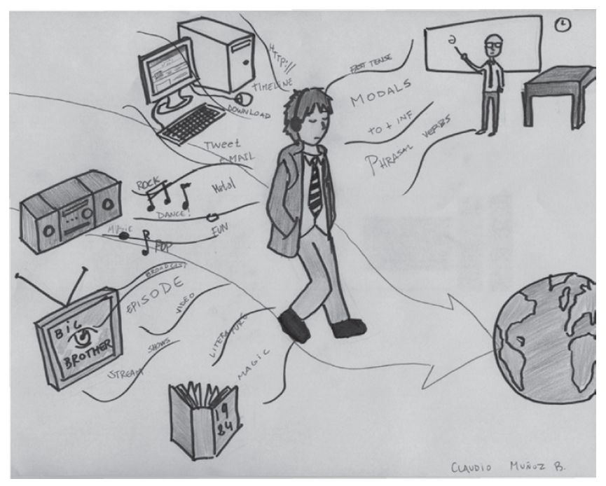 The drawing in Figure 1 done by a Chilean university student in an English education program provides a good illustration of the multiple modes of communication that this learner has at his disposal. This drawing was a response to a course task that asked students to graphically represent their conception of how they learn English as a second language. What do you, as readers, see in Figure 1? Are you surprised? Is anything missing? Would you add anything else?