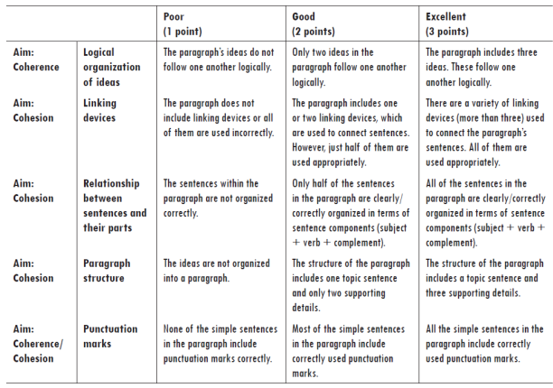 To collect data concerning the students' L2 writing proficiency, the experimental and control groups took a writing pre- and post-test which consisted of the production of one paragraph. These instruments were equivalent to the A2 level of English based on the CEFR (elementary level). As achievement tests, they were the best way for "assessing an individual's knowledge or proficiency in a given content area" (Glanz, 2014, p. 130). Subsequently, the learners' written paragraph was assessed by the teacher researcher, who referenced the criteria of a rubric (see Appendix A). For the purposes of the study, the assessment was focused on coherence (logical organization of ideas) and cohesion (linking devices, relationship between sentences and their parts, paragraph structure, and punctuation marks). The indicators of this instrument were 1 (poor performance), 2 (good performance), and 3 (excellent performance). The rubric's criteria were based on assessment dimensions included in instruments designed by Tankó (2005) and Aalto University (2014).