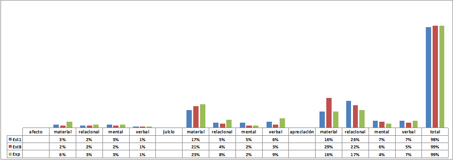 Según la figura 1, en los tres corpus la apreciación y el juicio estuvieron expresados en los cuatro tipos de cláusulas, mientras que el afecto resultó menos frecuente.