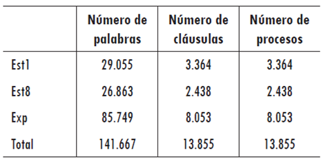 De acuerdo con la tabla 1, el corpus más extenso fue el de expertos, en número de palabras, de cláusulas y de procesos. En cambio, los corpus estudiantiles fueron más pequeños, sobre todo el de principiantes (Est1).