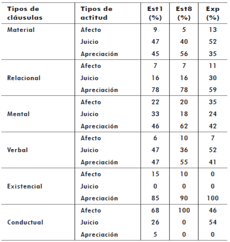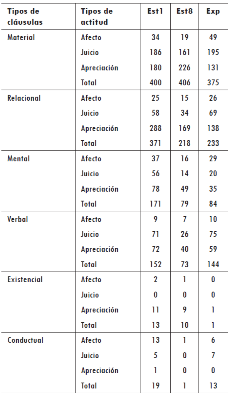 La apreciación sobresalió en cláusulas materiales y relacionales de los tres corpus, pero fue menor en cláusulas mentales y verbales. Por el contrario, el juicio fue más recurrente en cláusulas materiales de los tres corpus. Sin embargo, a nivel global, este tipo de actitud fue menor en cláusulas relacionales, mentales y verbales. Luego, el afecto mostró resultados muy bajos en los tres corpus dentro de los cuatro tipos de cláusulas.