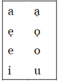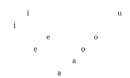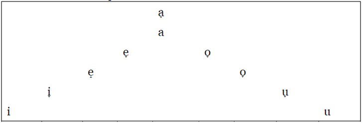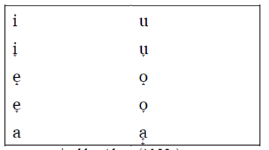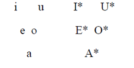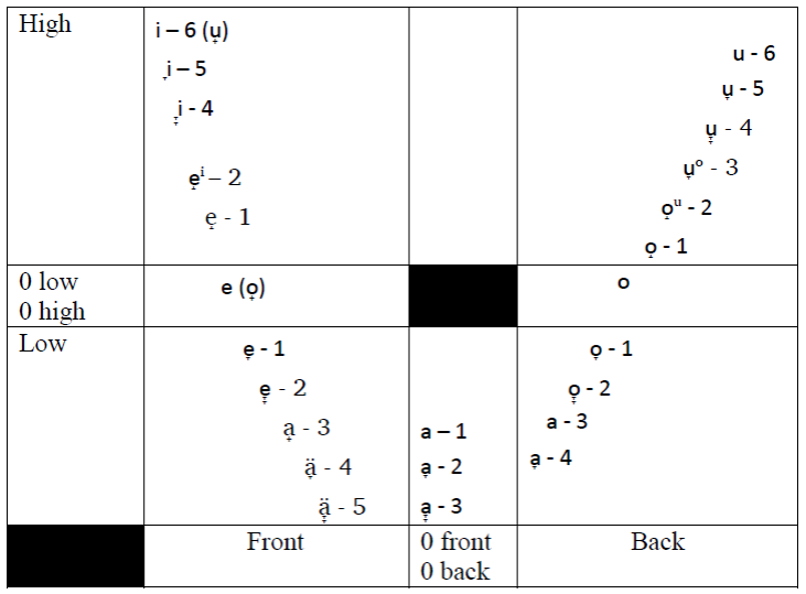Salvador (1957) also proposed a vowel system for EAS. His system had six degrees of openness (Figure 3), and at the time of the article the only language known to have six degrees of openness was Gweabo, a language from Liberia which Trubetzkoy (1949, p. 119) mentioned as a rare example: