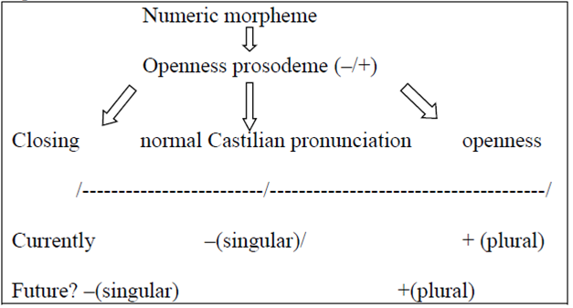 Contreras Jurado (1975) supported the idea that the EAS vowel system is the same one as in Castilian Spanish, but argued that there was a prosodeme which did not exist in Castilian Spanish (see Figure 5). This prosodeme is used as a numeric marker and it is redundant when there is a hangover of a deleted /s/. When the consonant /s/ disappears totally, the opposition -prosodeme/+prosodeme as numeric marker can be observed in EAS, and vowel closing seems to indicate a tendency to make this numeric prosodeme more effective. The singular/plural distinction is much more effective thanks to this.
