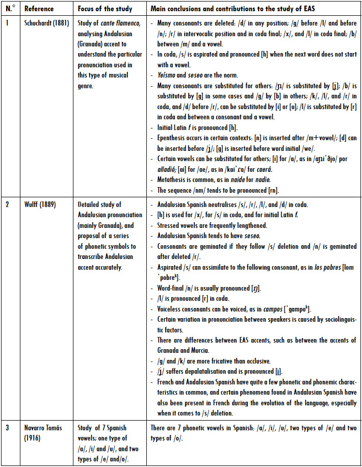 As shown in Zamora Vicente (1960, p. 316) and Jiménez Fernández (1999, p. 63), there have been sporadic comments on Andalusian Spanish since the twelfth century. However, in this article, I will consider only those studies which focus on EAS accent or whose findings are relevant for its study, (a summary of the works discussed is included in Appendix 1).