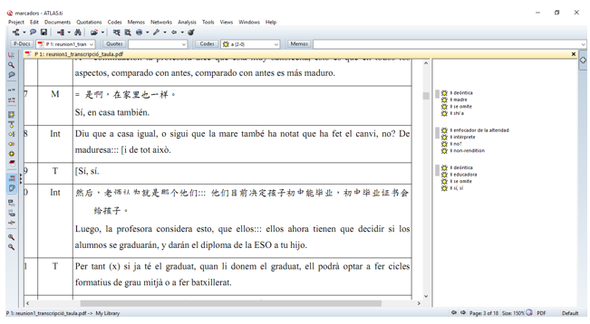 Atlas.ti nos ha permitido recuperar datos cuantitativos muy relevantes para describir la reunión analizada, como lo presentamos en la siguiente sección. En la figura 1 podemos observar una captura de pantalla con el etiquetado mediante Atlas.ti.