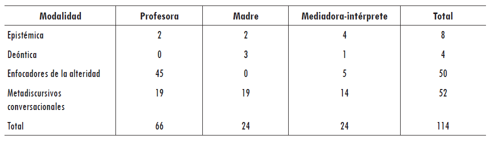 Hemos detectado 114 ocurrencias de marcadores conversacionales, distribuidos de la manera siguiente: profesora, 66; mediadora-intérprete, 24; madre, 24. Esta distribución es relativamente comprensible si tenemos en cuenta que la tutora ocupó turnos de palabra más largos que las otras dos emisoras. Por otro lado, es importante mencionar que los 24 marcadores conversacionales empleados por la mediadora-intérprete no corresponden a traducciones de los marcadores usados por las interlocutoras primarias (profesora y madre), sino que son en su totalidad adiciones propias (voz propia o non-renditions).