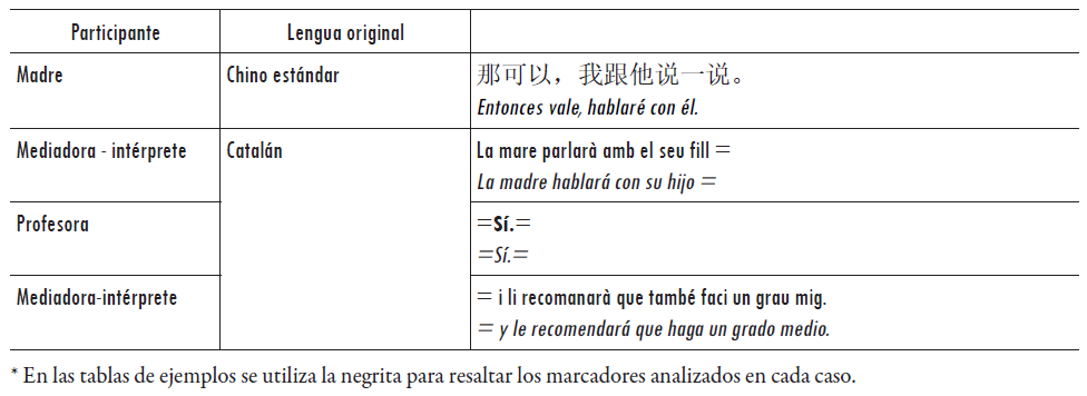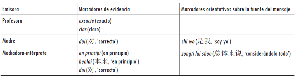 En nuestro corpus, la mediadora-intérprete utiliza repetidamente expresiones para indicar que la profesora es la autora del mensaje; por ejemplo: laoshi de yisi jiu shi shuo (老师的意思就是说, 'lo que quiere decir la profesora es que'), laoshi shuo jiu shi (老师说就是, 'la profesora lo que dice es que'), ta de yisi jiu shi shuo (她的意思就是, 'lo que quiere decir es que'), entre otras. Aunque en un principio nos planteamos si estas construcciones podían funcionar como marcadores orientativos de la fuente del mensaje, nos dimos cuenta de que esta estrategia asimismo se detecta en intervenciones hacia la profesora (por ejemplo, la mare diu que, 'la madre dice que', en la tabla 4). Si bien en catalán es bastante evidente la ausencia de incisos de entonación que delimiten estas expresiones -una de las características de los marcadores discursivos en general-, en chino, en algunos fragmentos, sí se puede producir un inciso después de estas expresiones, por lo que no es tan claro que no pudieran ser consideradas marcadores.