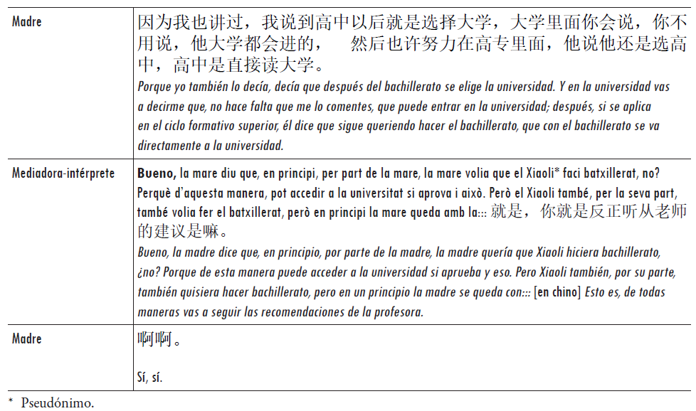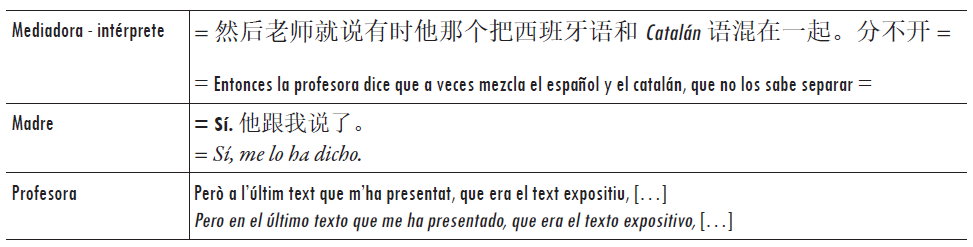 La interacción analizada es una reunión que tuvo lugar en un instituto del área metropolitana de Barcelona. En este encuentro participaron la profesora (tutora) de un alumno de cuarto de educación secundaria obligatoria (ESO), que hablaba en catalán; la madre de este alumno, que hablaba en chino estándar, con un fuerte acento e influencia de su dialecto materno;8 y la mediadora-intérprete, que combinó durante la reunión el uso de chino estándar (para dirigirse a la madre) y catalán con cierta influencia del español (para dirigirse a la profesora). Hablamos de "mediadora-intérprete", porque si bien era una profesional contratada como mediadora intercultural por el ayuntamiento (alcaldía), su función en esta reunión era básicamente interpretar.