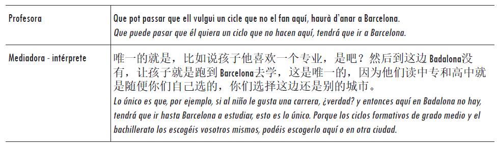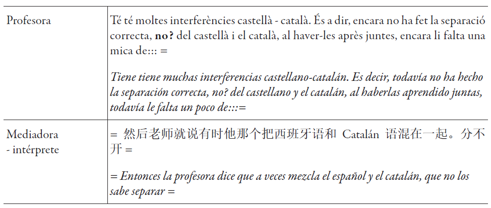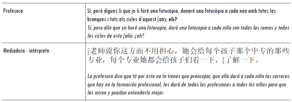 En el extracto anterior, la mediadora-intérprete utiliza bueno para iniciar su turno y parece que le sirve también para indicar que lo que va a seguir es un poco una recapitulación de lo que ha dicho la madre. A media intervención, la mediadora-intérprete deja una oración en catalán inacabada y cambia al chino para dirigirse a la madre y confirmar parte de la información recibida. En este caso, la mediadora-intérprete utiliza la expresión jiushi (就是) para iniciar su intervención en chino e introducir la pregunta hacia la madre. Esta última simplemente confirma la información con la repetición de la interjección a (啊).