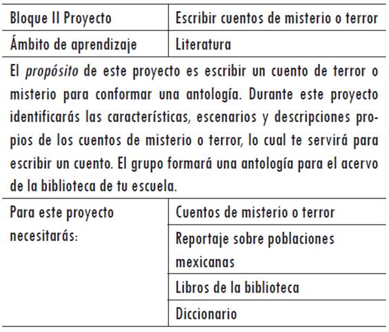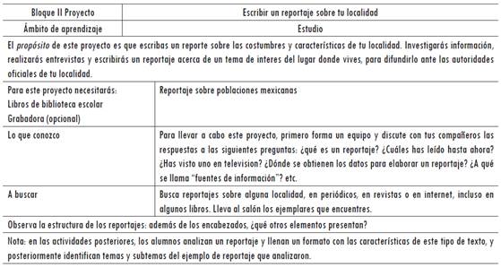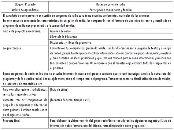 Al analizar los libros en cuestión, se encontró que, en los libros de español, gran parte de las actividades son comunicativas y colaborativas, por lo que se realizan en grupos que planean, desarrollan y presentan los proyectos. Como se muestra en la tabla 6, en cada bloque se propone una secuencia de actividades, a llevar a cabo por equipos, que pretenden conducir a los alumnos a desarrollar el producto o proyecto correspondiente a un ámbito de aprendizaje. Las primeras actividades en la elaboración del proyecto son inductivas y de descubrimiento. Posteriormente, los alumnos analizan ejemplos de otros textos o productos (por ejemplo, instructivos, poemas, juegos, cuentos o leyendas) para ver sus características y con esa información llenan cuadros o completan otros ejemplos.