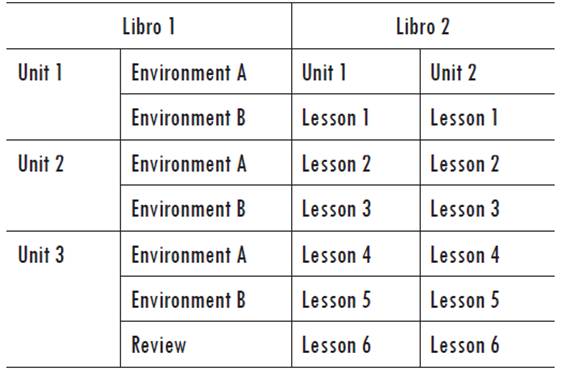 Sin embargo, al analizar ambos tipos de libros de texto (español e inglés), encontramos diferencias significativas en las maneras como dichos textos organizan sus contenidos. Los libros de español organizan el contenido en cinco bloques y, en cada uno de estos, los niños deben desarrollar prácticas sociales del lenguaje y elaborar proyectos para los siguientes tres ambientes o ámbitos de aprendizaje: familiar y comunitario, académico y de formación, y literario y lúdico. Como se aprecia en la tabla 1, el índice estructura el contenido desde el inicio, y cada bloque lleva como título la práctica social del lenguaje y el producto específico que se estará trabajando en esa secuencia de lecciones, por ejemplo, escribir un recuento histórico, escribir biografías y autobiografías, etc. Esto permite tener claridad sobre la temática y el objetivo que se busca desarrollar desde el inicio de cada bloque.