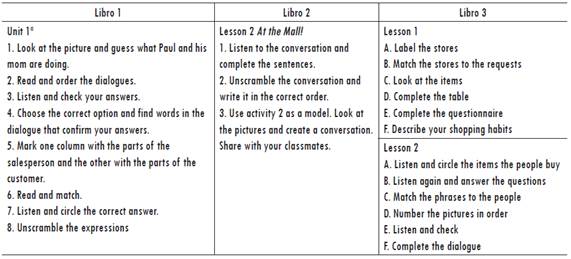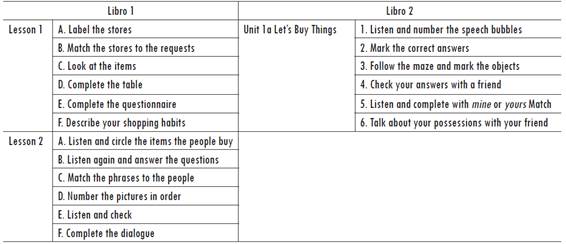 Los libros de inglés analizados, por su parte, inician con actividades de presentación o de integración, pero no de introducción a un producto o proyecto, e incluyen principalmente actividades centradas en escuchar o leer textos y, con base en ello, solicitan a los estudiantes que, en la mayoría de los casos de manera individual, completen oraciones y diálogos; relacionen imágenes con palabras de vocabulario y, en algunos casos, produzcan al final segmentos de lenguaje, ya sea de manera escrita u oral (véase tabla 7). Uno de los libros presenta las actividades como parte de un proceso (Beginning, The Stages, Presentation); sin embargo, la secuencia de actividades en la mayoría de los libros es muy similar a la conocida P-P-P (Presentation, Practice, & Production) de Richards y Rodgers (2009), donde el lenguaje se presenta, practica y finalmente se produce de manera gradual. Por ser libros dirigidos a niños, también incluyen actividades de introducción o warm-up al inicio. Las demás actividades que conforman las unidades se orientan a enseñar vocabulario y segmentos de lenguaje, en ocasiones relacionados con alguna “función” (por ejemplo, going shopping, asking prices) vinculada con la práctica social del lenguaje.