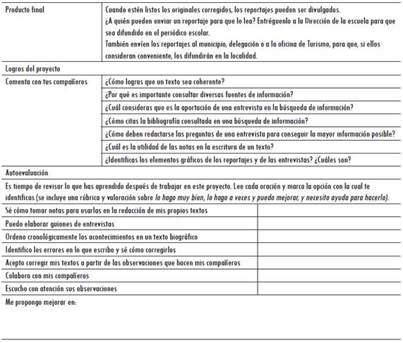 Sin embargo, al analizar los libros de texto de español e inglés, encontramos nuevamente diferencias significativas en las maneras en que cada tipo de texto aborda el asunto de la evaluación. En los libros de español, como se puede apreciar en la tabla 8, una vez que los alumnos han trabajado en la elaboración de un proyecto, lo presentan al grupo o la comunidad escolar como evidencia del logro de la práctica social específica del ambiente de aprendizaje de la unidad didáctica. Esta última etapa de socialización da un objetivo real y motivacional a los niños. Adicionalmente, para cerrar el proceso, los alumnos realizan una autoevaluación, donde básicamente se preguntan si lograron las competencias específicas de esa práctica social y sobre el trabajo en equipo que desarrollaron. A esta etapa se integra una actividad de “Logros del proyecto”, donde los niños analizan las características de su producto. Asimismo, al final de cada bloque, los alumnos hacen una evaluación de los contenidos de todo el bloque.