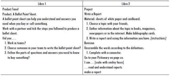 El resto de los libros de inglés analizados no menciona o integra la elaboración de productos, ni sus actividades promueven el trabajo colaborativo o las demás características de la metodología de enseñanza de prácticas sociales del lenguaje mediante productos situados, como se propone en el currículo oficial.