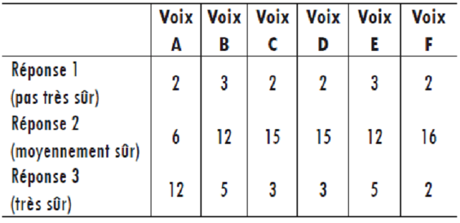 Consigne du test : Qualifiez les voix suivantes par rapport à l'autorité (1 = pas très autoritaire, 2 = moyennement autoritaire, 3 = très autoritaire).