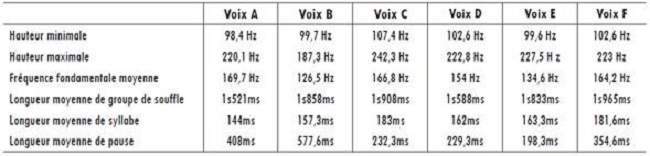 À l'aide du logiciel libre Praat, nous avons analysé les caractéristiques acoustiques et prosodiques de chacun des extraits afin d'avoir un aperçu des différentes voix utilisées lors du test de perception. Ci-dessous, le Tableau 3 compare les six voix (les différences de couleur correspondent à l'orientation sexuelle des individus) :