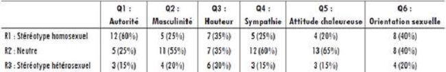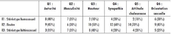 Stéréotypes : Le nombre de réponses 2 (neutre) parmi les juges reste le plus important pour toutes les questions, particulièrement pour celles portant sur la sympathie et l’attitude chaleureuse. Si l’on rentre dans le détail, nous observons des avis partagés entre la réponse 1 (stéréotype homosexuel) et 2 (neutre) pour l’autorité. Par contre, les avis sont partagés entre la réponse 2 (neutre) et 3 (stéréotype hétérosexuel) pour la hauteur.