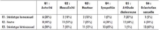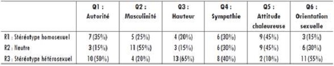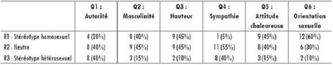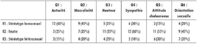 Stéréotypes : Le critère autorité est le seul où nous percevons une tendance claire : plus de la moitié des juges trouvent que cette voix n’est pas très autoritaire (stéréotype homosexuel). Pour la masculinité, les avis sont partagés entre la réponse 1 (stéréotype homosexuel) et la réponse 2 (neutre). Pour le reste des questions, c'est la réponse 2 (neutre) qui l'emporte.