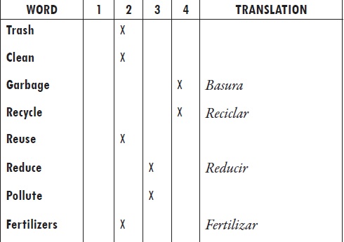 In this activity, students read an article about how to reduce land pollution, watched a video about landfills and waste, and played a recycling mission game, all of which offered many opportunities to use and monitor new and recycled words. They used a vocabulary inventory to register new words and the vocabulary-learning strategies (a drawing, a synonym, a sentence containing the word, a definition) that had helped them learn these words.