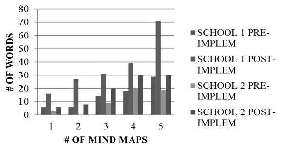 The number of words students recalled increased steadily as they completed their mind maps. Figure 1 depicts the results by school and the number of words recalled. At the end of the intervention, students from School 1 could recall approximately twice as many words as those from School 2, a difference that seems directly related to the higher percentage of students using strategies prior to this experience in School 1. Although Figure 1 does not indicate the knowledge students had about the words they could recall, a direct relationship between the use of strategies (Table 1) and the number of words recalled seems evident. This result aligns with Griffiths’ (2003) finding that ‘those students who made the most progress were the ones who most increased their language strategy use’ (p. iii).