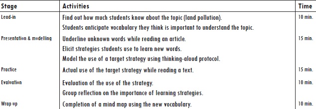 The strategy development stage required students to activate prior knowledge and reflect on the topic of land pollution as it related to their own context. We guided students in the use of determination and consolidation vocabulary learning strategies (Cook & Mayer, 1983) and in reflecting on the most common problems they experienced when learning new vocabulary. Through modelling and think-aloud protocols (Deschambault, 2012), we helped students to become more familiar with specific metacognitive strategies (planning, monitoring, and evaluating; Harris, 2003) and reflect on their efficacy. We structured each of the strategy development sessions on vocabulary and metacognitive strategies with an adaptation of the cognitive academic language learning approach (CALLA; Chamot & O’Malley, 1996), which suggests five basic stages: preparation, presentation, practice, evaluation, and expansion. Table 1 illustrates the activities executed in a vocabulary learning strategies session.