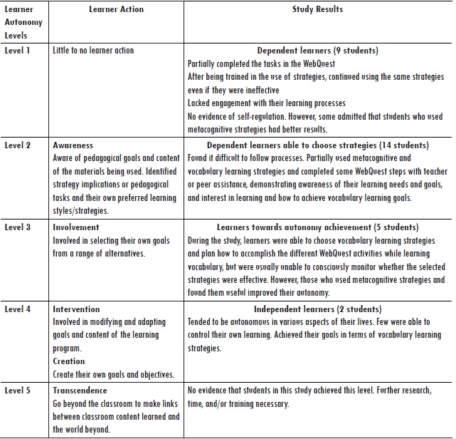 Incorporating metacognitive strategies within WebQuests can enhance students’ abilities to acquire new vocabulary autonomously (Harris, 2003). Similarly, analysis of our interview results shows that (1) 30% of students planned which words to learn independently and 43% self-selected the vocabulary learning strategies to use, (2) 52% took effective action with the selected strategies, (3) 52% found the vocabulary learning strategies effective, (4) 54% remembered more words, and (5) 57% solved problems by collaborating with peers or the teacher. Additionally, we found that the collaborative work required by the WebQuest activities, in which students learned from each other as they planned, monitored, and evaluated vocabulary learning, helped develop student autonomy. Equally, however, we determined that the teacher retains an important role as a facilitator, particularly for dependent learners, as students who received continuous feedback, repeatedly monitored and assessed by the teacher in their use of metacognitive and vocabulary learning strategies, seemed to gain self-confidence that encouraged a more frequent use of the strategies. Nunan (1997, p. 195) argues that autonomy emerges at different levels; in the context of this study, it required the internalization of vocabulary learning strategies. Table 3 shows how participants reached different degrees of autonomy in their uses of metacognitive strategies.