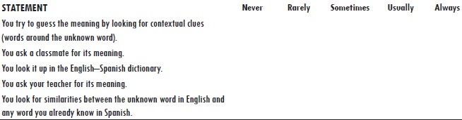 The monitoring strategy refers to ongoing awareness of whether ‘there is no understanding of an activity and to stop and do something about it’ (Griffiths, 2008, p. 101). Monitoring learning includes checking task information to validate comprehension and to focus attention on important vocabulary related to main ideas (Swartz, 2003). In the present study, this strategy helped students identify problems and solve them through conscious use of vocabulary learning strategies.