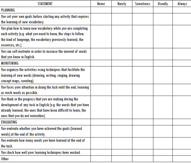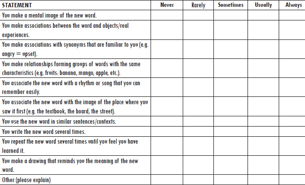 Data validity was supported through the collection of information from various participants by means of different instruments so as to examine the phenomena studied from multiple perspectives (Burns, 2003). Data were collected through pre- and post-questionnaires, student learning logs, a semi-structured interview, self-assessment checklists, and mind maps. Students were permitted to use Spanish to answer questions involving reflection on the use of strategies to facilitate the expression of their views. Questionnaires (Dornyei, 2003) were this study’s primary source of quantitative data and were used to look for initial and final indications about participant’s use of the studied strategies. Both questionnaires comprised 29 items, expressed as statements and arranged into groups: personal details (4 items), use of vocabulary learning strategies (15 items), and use of metacognitive strategies (10 items). Learning logs (Friesner & Hart, 2005) were used to help students reflect on problems encountered when using vocabulary learning and metacognitive strategies, as well as possible solutions at the beginning, middle, and end of the interventions (Appendix B), data which helped us analyse the learners’ strategy use more deeply and to corroborate the information gathered through the questionnaires. Interviews were used ‘to go deeper into the motivations of respondents and the reasons for responding as they do’ (Cohen, Manion, & Morrison, 2007, p. 351) regarding the effectiveness of the strategy training and other affective issues in the development of autonomy. The students also used self-assessment checklists to help them evaluate (Ross, 1998) their use of metacognitive strategies, and created mind maps (Wheeldon & Faubert, 2009) using the vocabulary they knew (and were later able to recall) on the topic of land pollution.