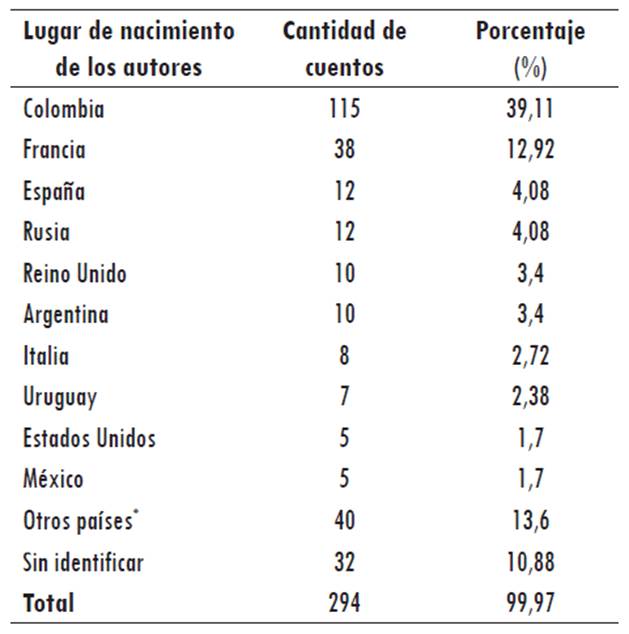 Con la selección de estos treinta cuentos, escritos por los autores mencionados (todos más o menos contemporáneos), me referiré a un fenómeno particular, homólogo al resultado de estas estadísticas y que permitirá comprenderlo mejor: la manera en la que las literaturas francesa, rusa y española figuran en la publicación periódica (en el caso de los cuentos franceses y rusos, a partir de la traducción) y su funcionamiento como referentes para los autores colombianos, específicamente sus implicaciones para el género cuento.