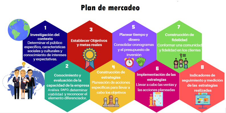Para conocer y evaluar la capacidad de la empresa se usa la matriz dafo,3 se definen objetivos reales, se planean estrategias de mercadeo ajustadas a tiempos y costos, se plantean indicadores de seguimiento, se fidelizan los clientes, etc. La Figura 1 resume los momentos claves en la escritura del plan de mercadeo.